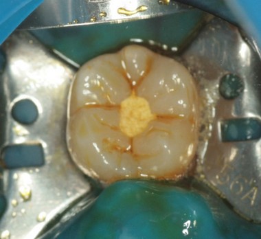 カリエス除去後まず、遠心をレジン充填(隔壁)。フロアブルレジンを使用。