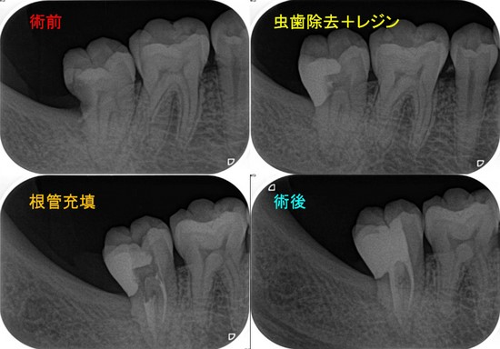 ? この歯は樋状根でした。根管治療後、レジンコア+レジン充填にて修復を行いました。