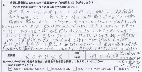 錦部製作所の製品は全体に少ないパワーで患者に痛みを与えない、周囲組織を傷めないコンセプトがつらぬかれていて非常に良いです。