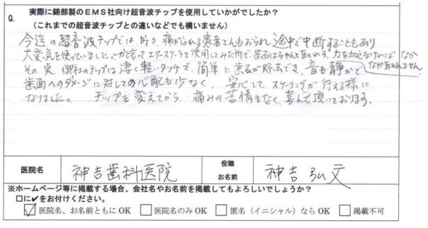 今迄の超音波チップでは、時々、痛がられる患者さんもおられ、途中で中断することもあり大変気を使っていました。