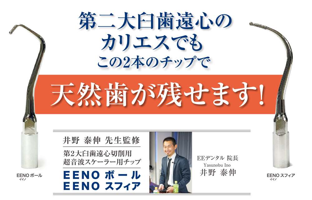 「EENOフラットやEENOボールは使用場面が限られるが、EENOスフィアにおいては、あらゆる軟化齲蝕除去に用いることが可能なため、使用頻度においてはタービン・5倍速・モーターに劣らないほど手放せなくなる。」